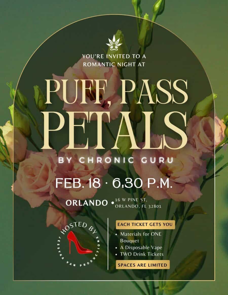 Your ticket includes a complimentary vape and two handcrafted drinks as a special gift. Step into an evening designed to inspire creativity, connection, and relaxation at our exclusive Puff Pass & Petals experience. This thoughtfully curated event blends art, cannabis culture, and a welcoming atmosphere into a night you’ll remember. Wednesday, February 18th, 2026 6:30 PM – 10:00pm Location: 16 W Pine St, Orlando, FL 32801 Events at other locations: [event_button url="https://chronicguru.com/event/puff-pass-petals-durham-nc/" label="Durham 2/25" expires=" 02/25/2026" ]Important Notes