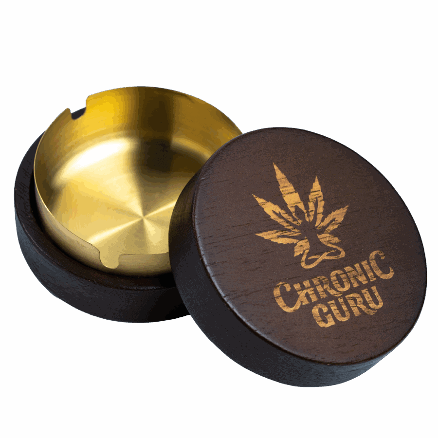 A compact wooden ashtray with a fitted lid and removable gold-finished stainless steel insert. Finished with the CG logo for a clean, elevated touch.