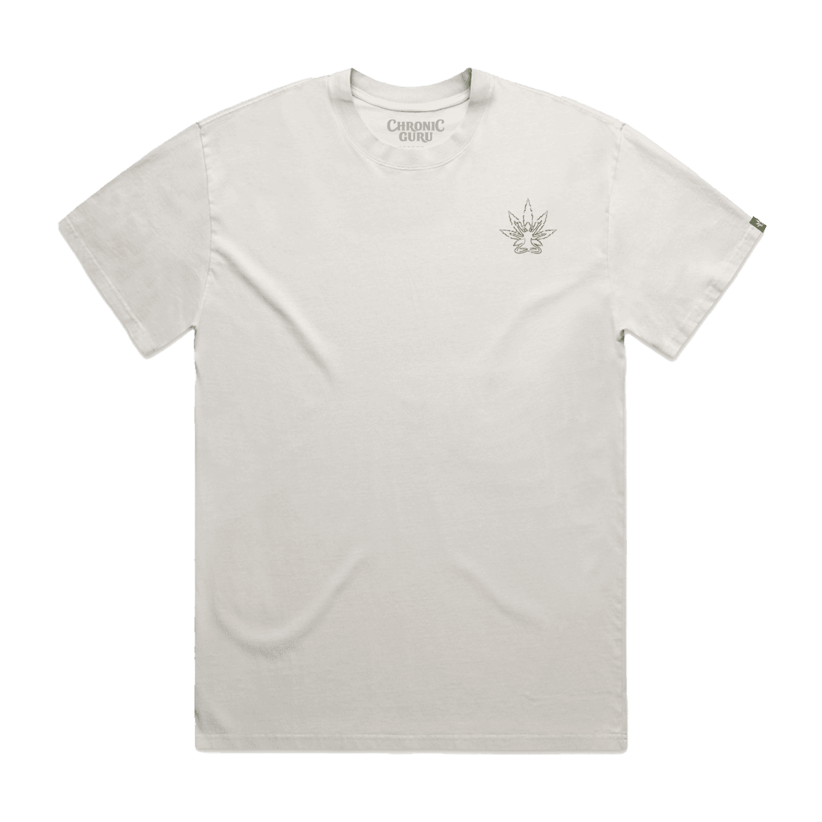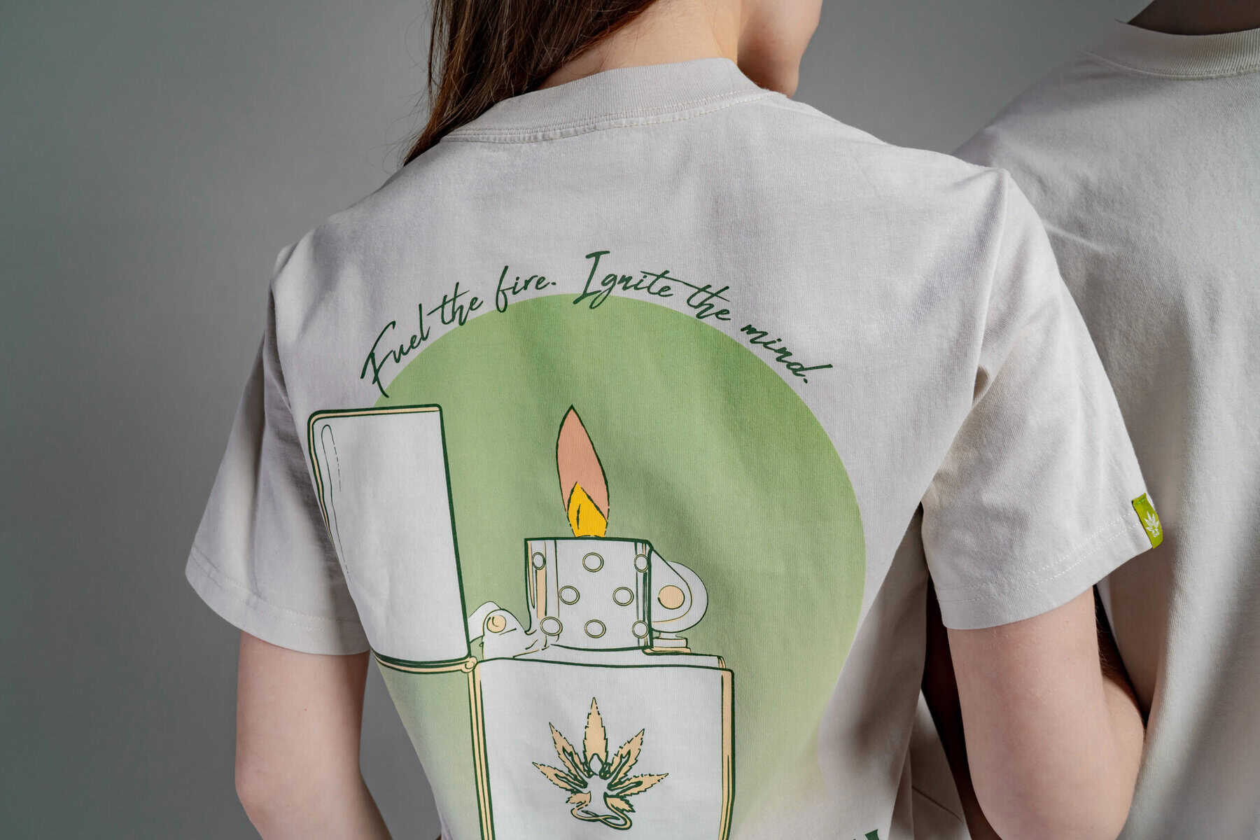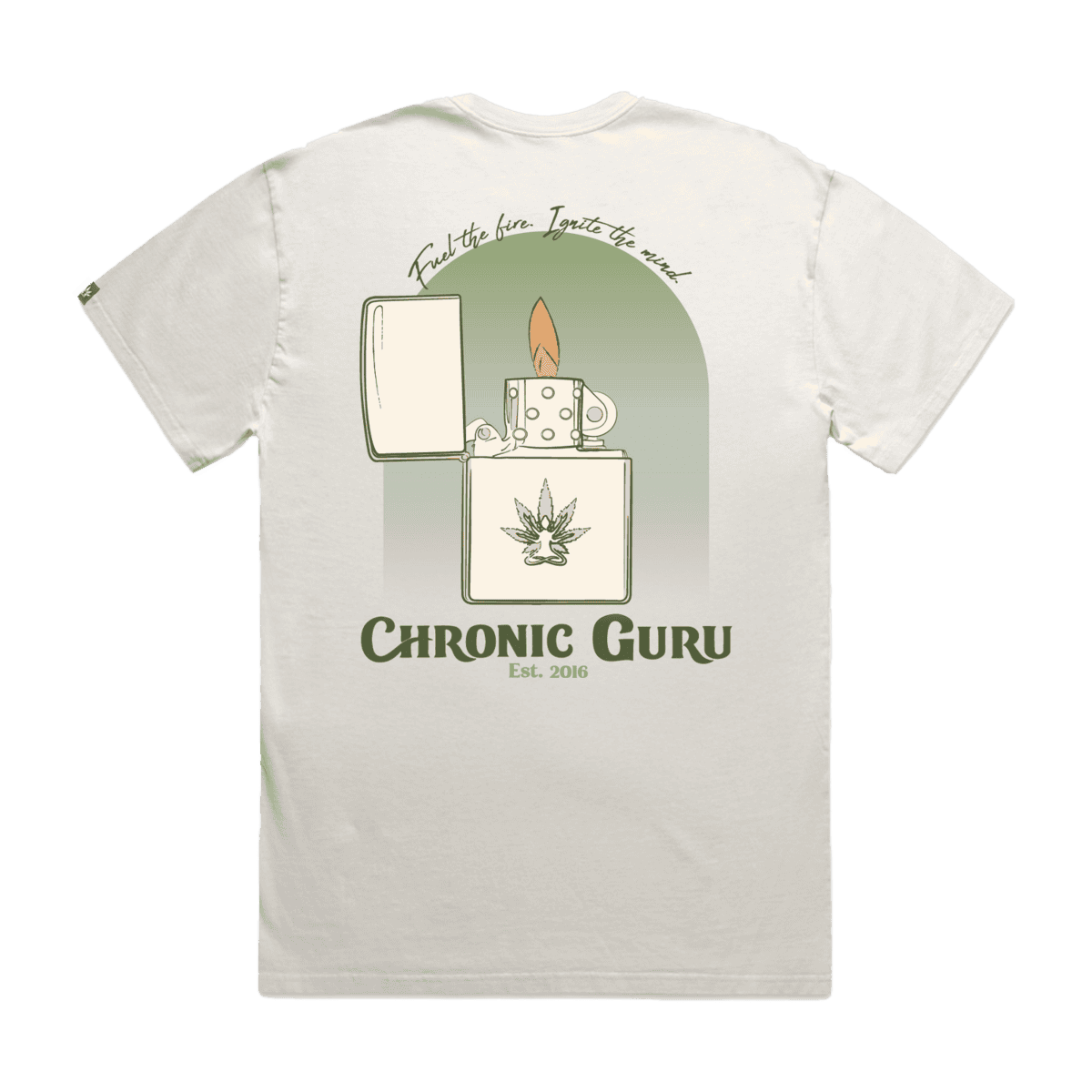 The back graphic sets the tone: a hand-drawn lighter illustration, leaf emblem, and the words Fuel the fire. Ignite the mind. It nods to ritual, reflection, and that spark of something deeper. Up front, things stay simple with a tonal leaf logo over the chest—just enough detail to feel intentional without being loud.