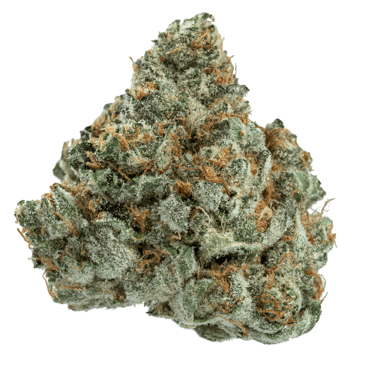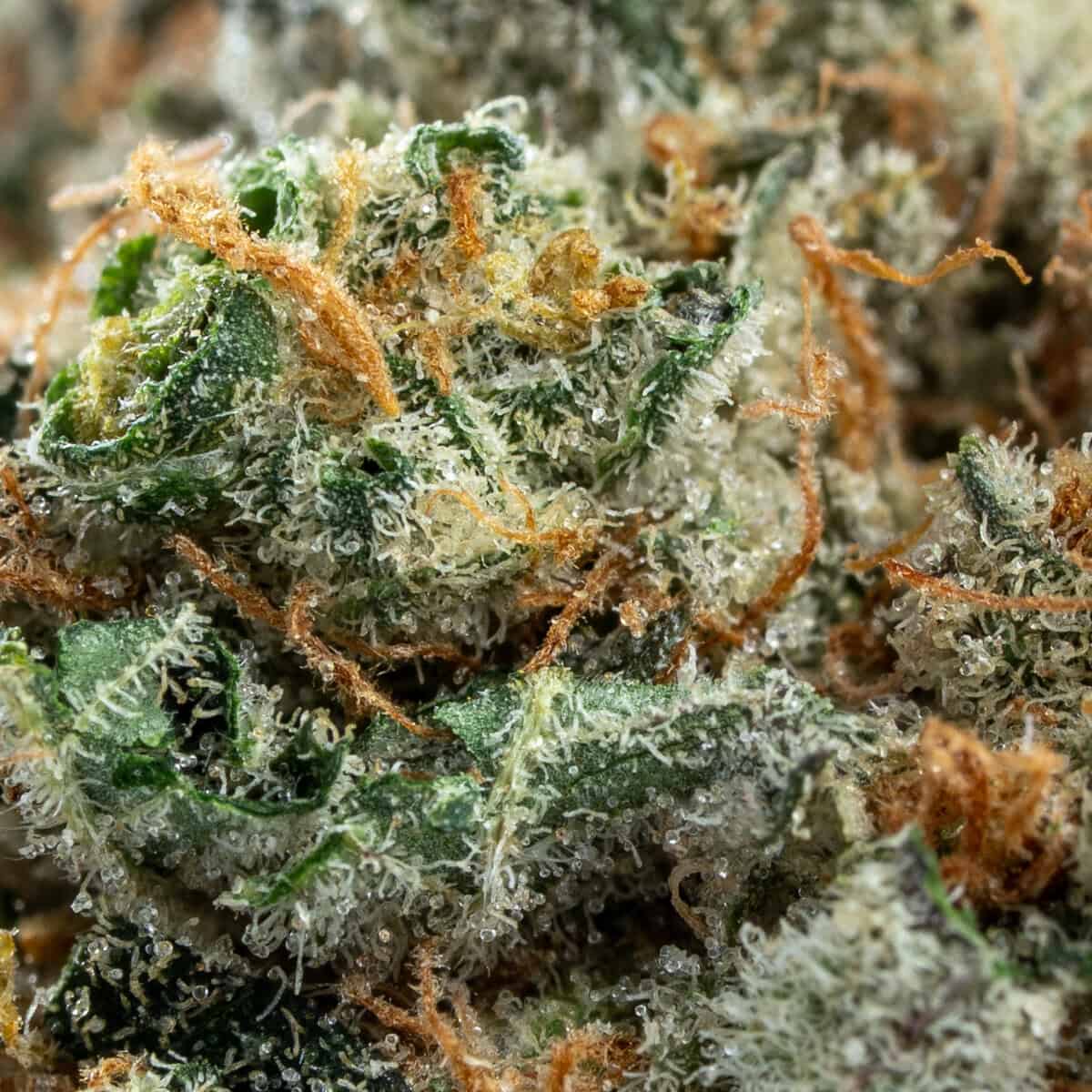 This strain features chunky, frosted buds in deep greens and purples, with bright orange pistils and a glittering coat of trichomes that hint at its potency and sweet flavor.
