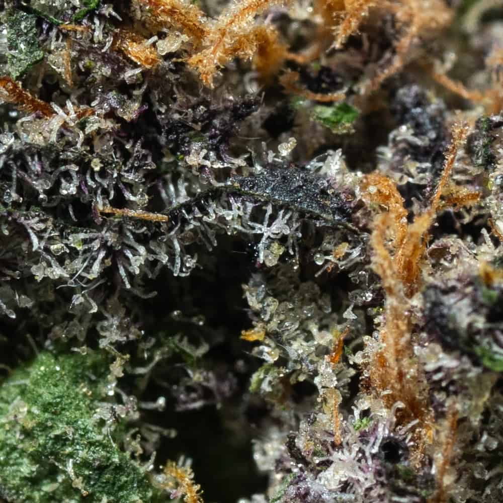 - A frosty layer of crystalline trichomes, giving it a sparkling and premium finish
