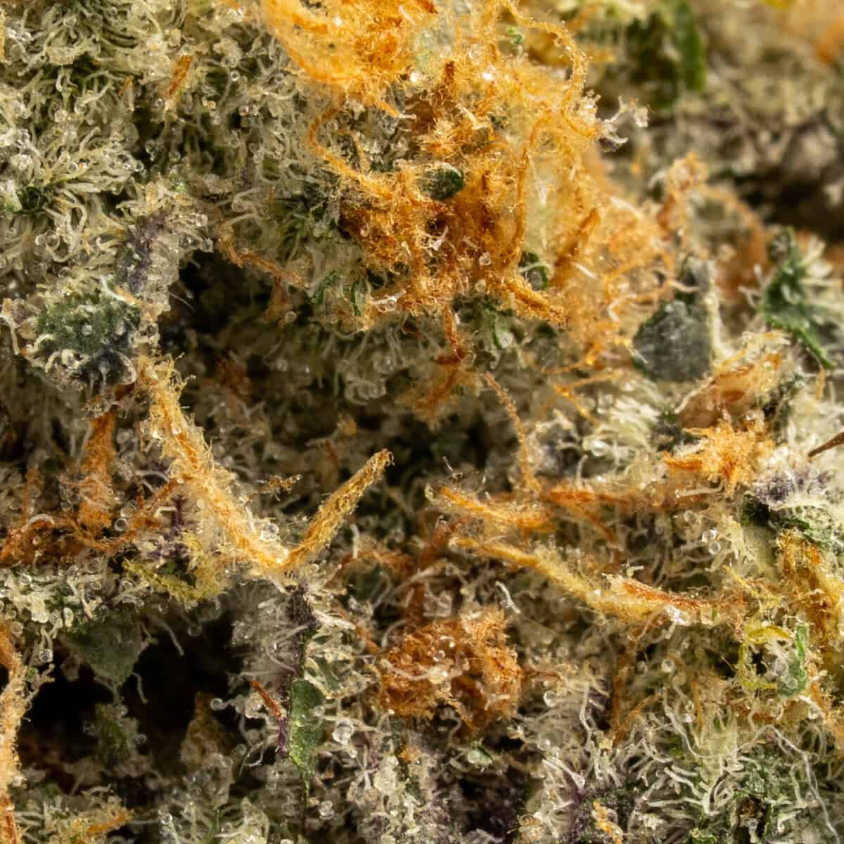 Berry Punch showcases dense, deep green buds with streaks of purple and vibrant orange pistils. A heavy layer of frosty trichomes gives the buds a sticky, resinous texture, enhancing their bag appeal.