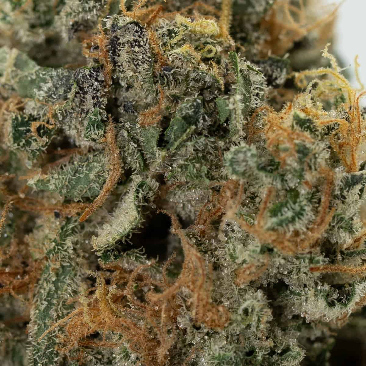 Cheetah Piss buds are dense and well-structured, displaying a bright green color with hints of yellow. These buds have a generous coating of frosty trichomes, giving them a sparkling, crystal-like appearance. Bright orange pistils weave through the buds, enhancing their visual appeal and indicating high quality.