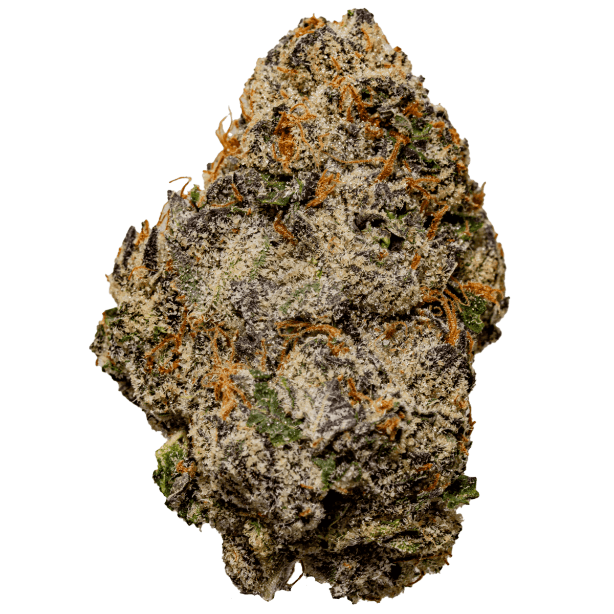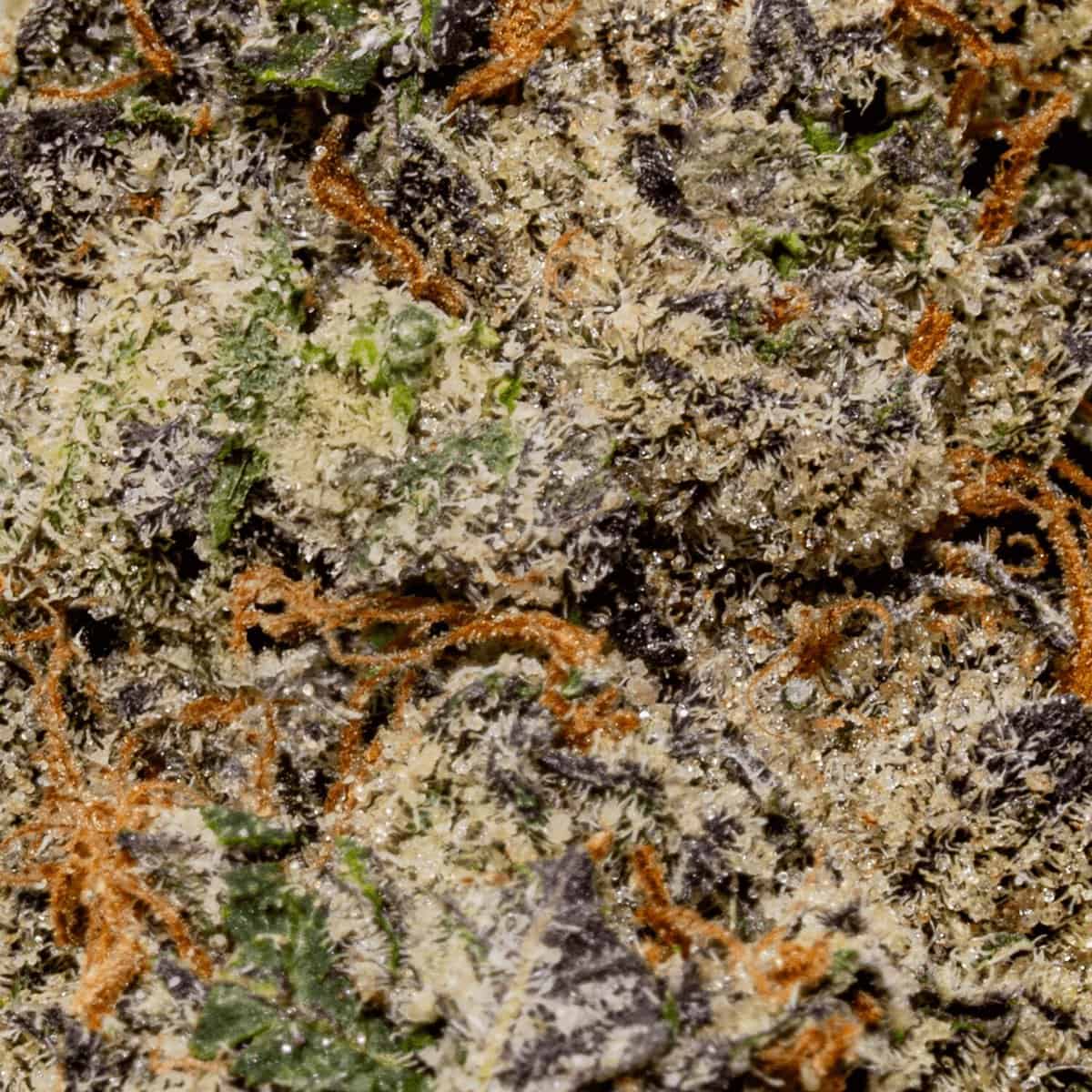This strain captivates with its dense, forest-green buds adorned with deep purple streaks and vibrant orange pistils. A thick layer of crystalline trichomes coats the nugs, giving them a frosty and resinous appearance that reflects their premium quality and potency.