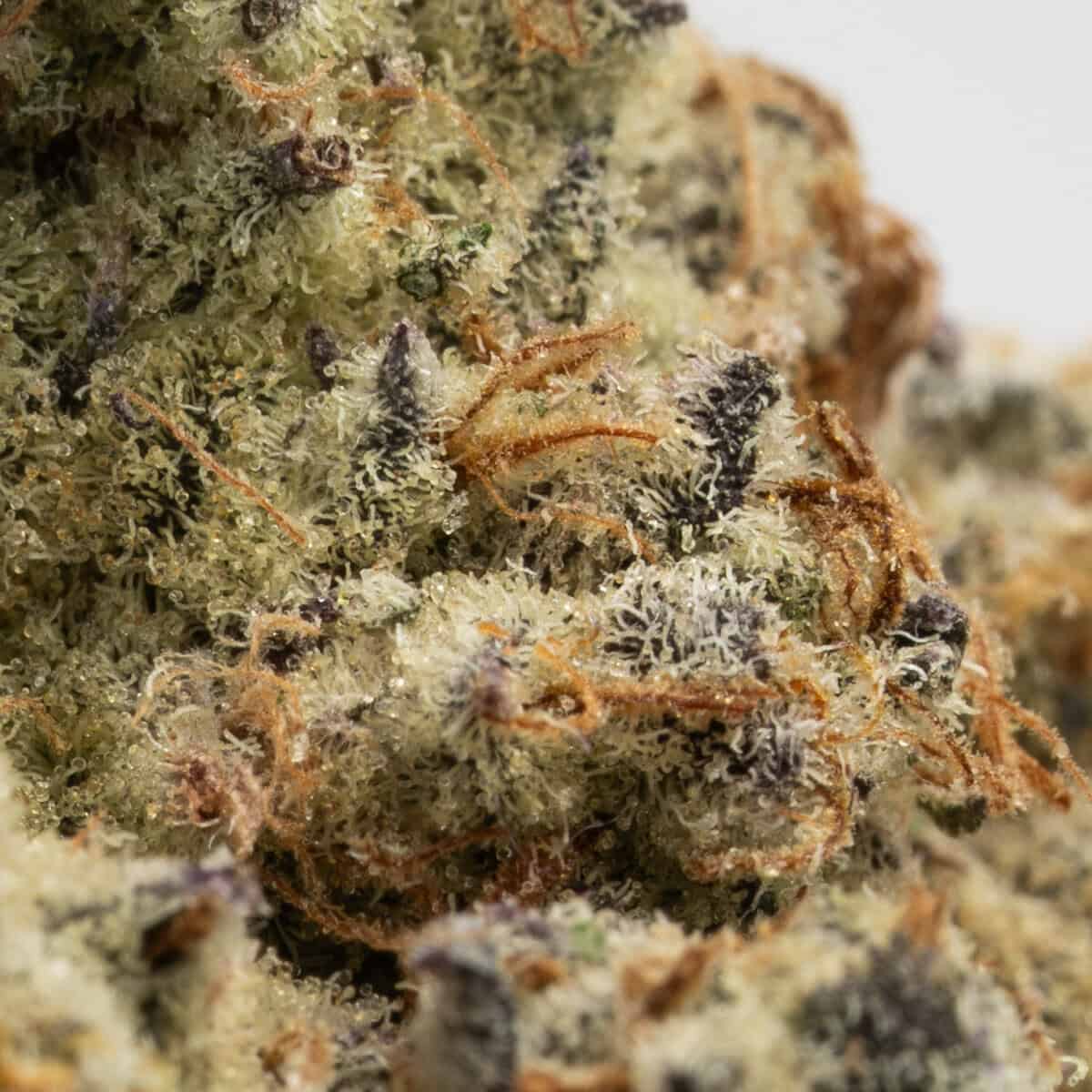 Devil’s Driver buds are medium-dense and coated in shimmering trichomes, giving them a frosty glow. Shades of bright green are accented with amber pistils, while occasional purple hues peek through the surface.