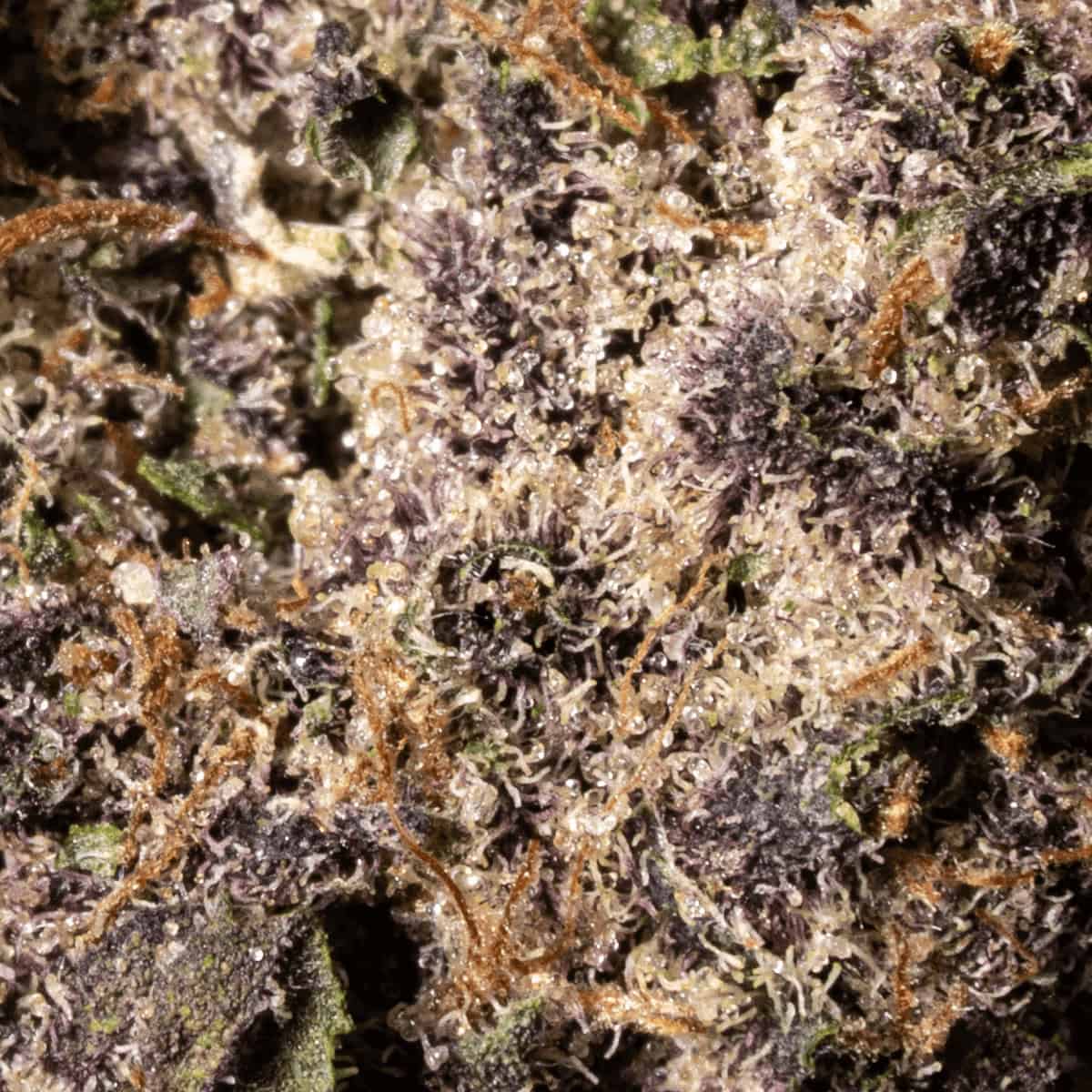 Grape Soda boasts dense, purple-tinged buds with deep green highlights and vibrant orange pistils. A frosty coating of trichomes gives it a sparkling, resinous finish, emphasizing its high-quality genetics.