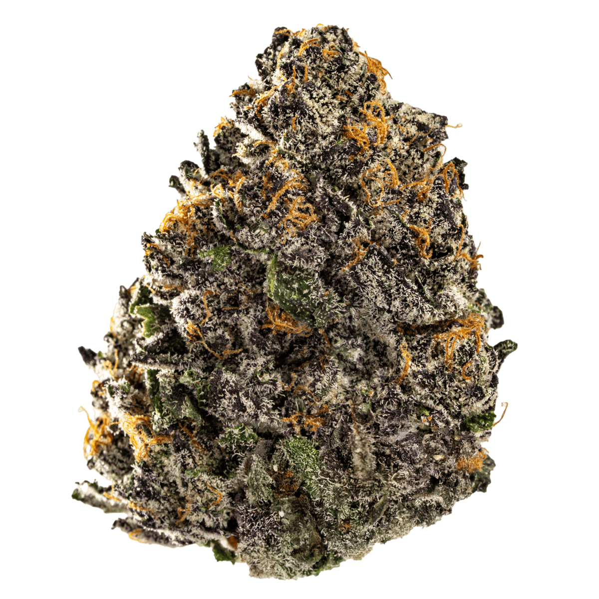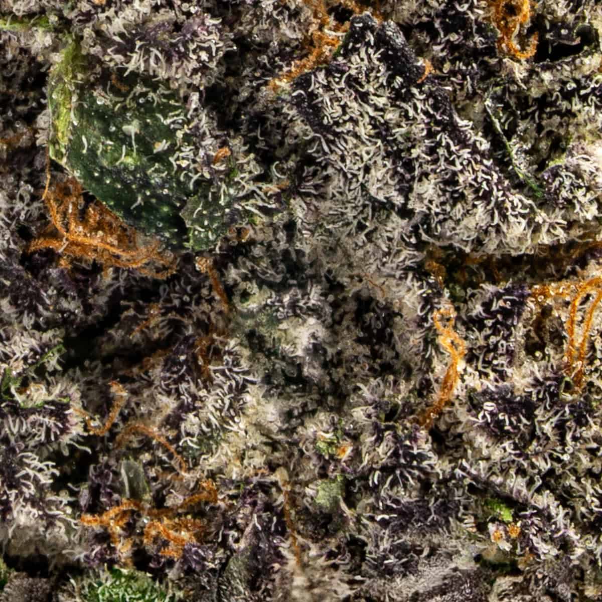 Insane Pound Cake features dense, resinous buds in deep green and purple shades, accented by fiery orange pistils and heavy trichome frosting, giving it a thick, sugar-coated look that hints at its potency.