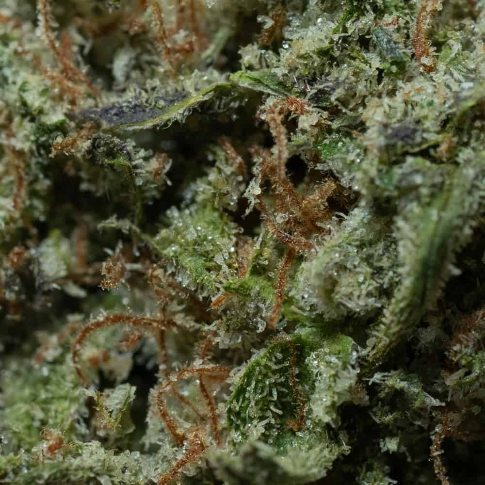 - A frosty coating of glistening trichomes that highlights its potency