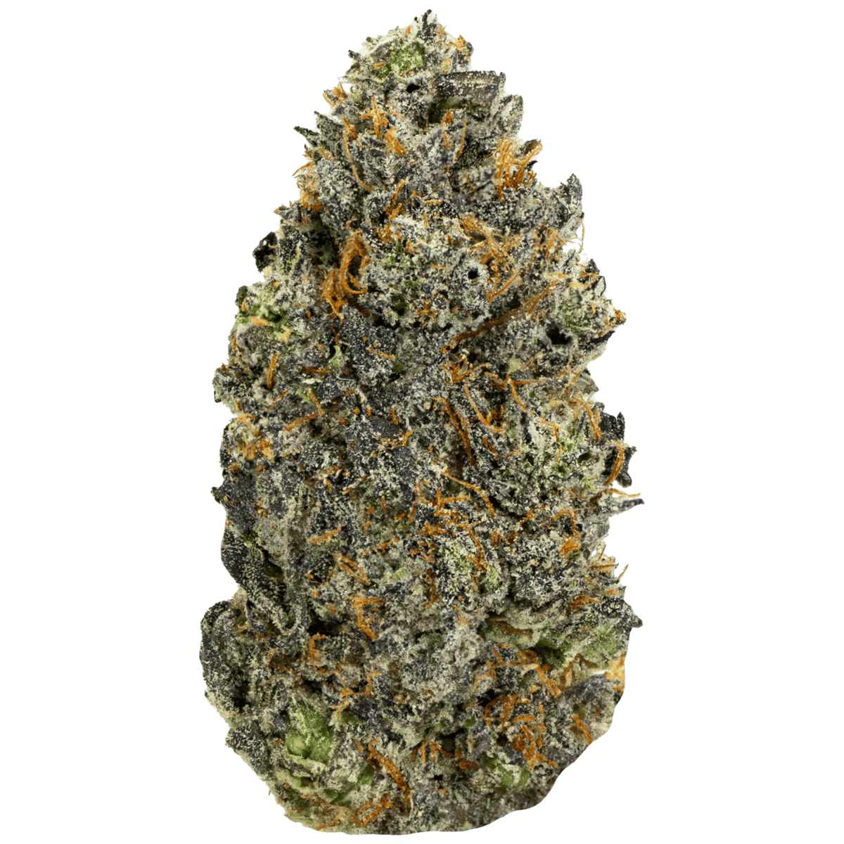 This strain captivates with its dense, forest-green nugs adorned with dark purple and beige undertones. Additionally, amber-colored hairs wind through the buds, all covered by a frosty layer of purple-tinted white trichomes. This combination gives the strain a striking, shimmering appearance that promises potency and quality.