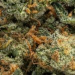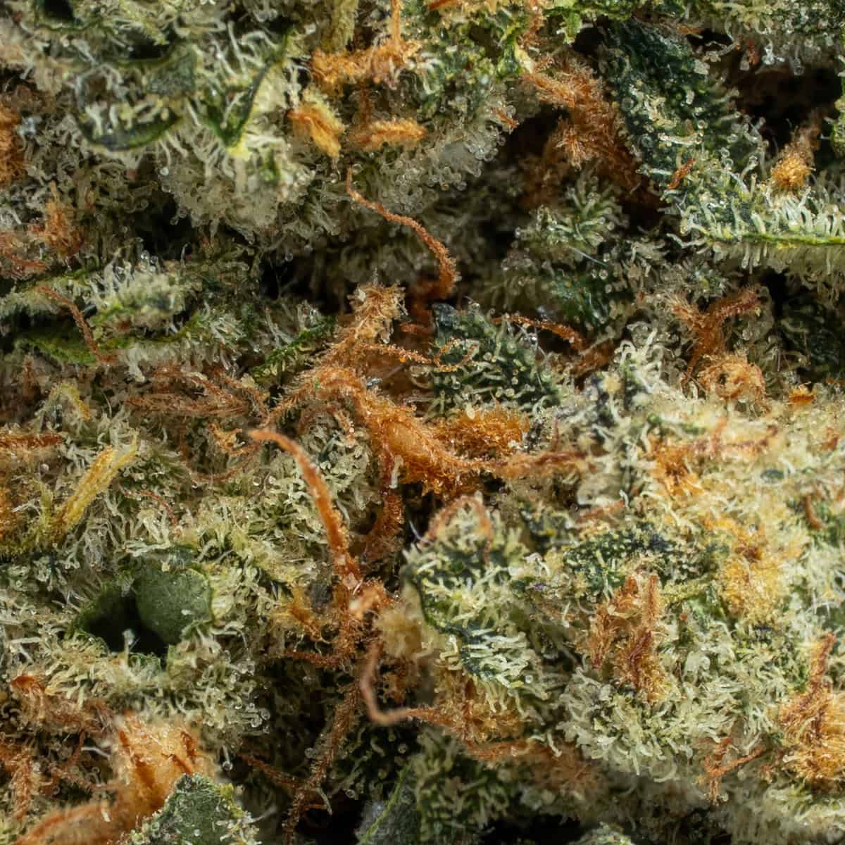 Strawberry Cough buds are medium-sized and frosty, with light green hues and orange pistils winding through. A layer of sparkling trichomes enhances its sweet berry appeal.