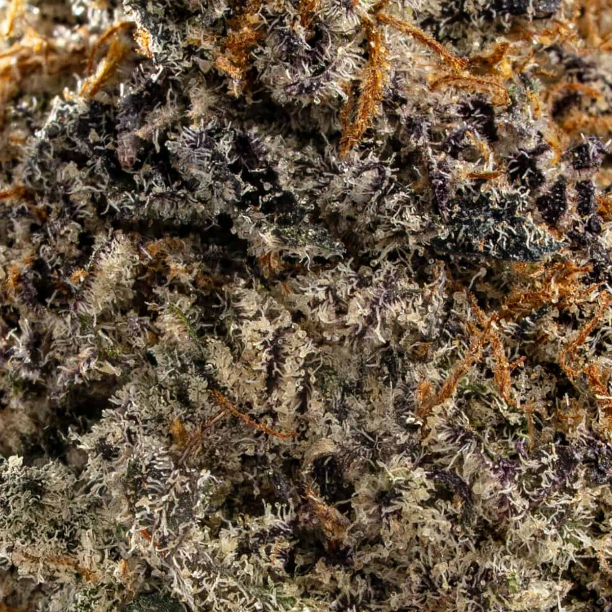 Vanilla Fog features dense, fluffy buds dusted in frosty trichomes, with light green and soft purple hues intertwined with bright orange pistils, giving it an inviting, sugar-coated look.