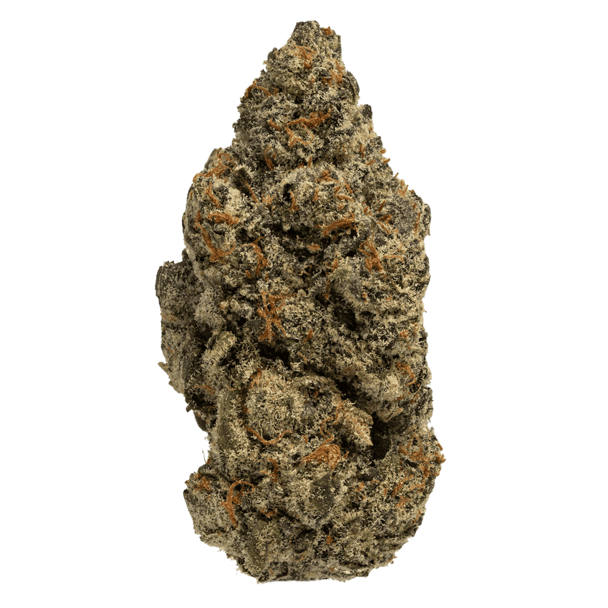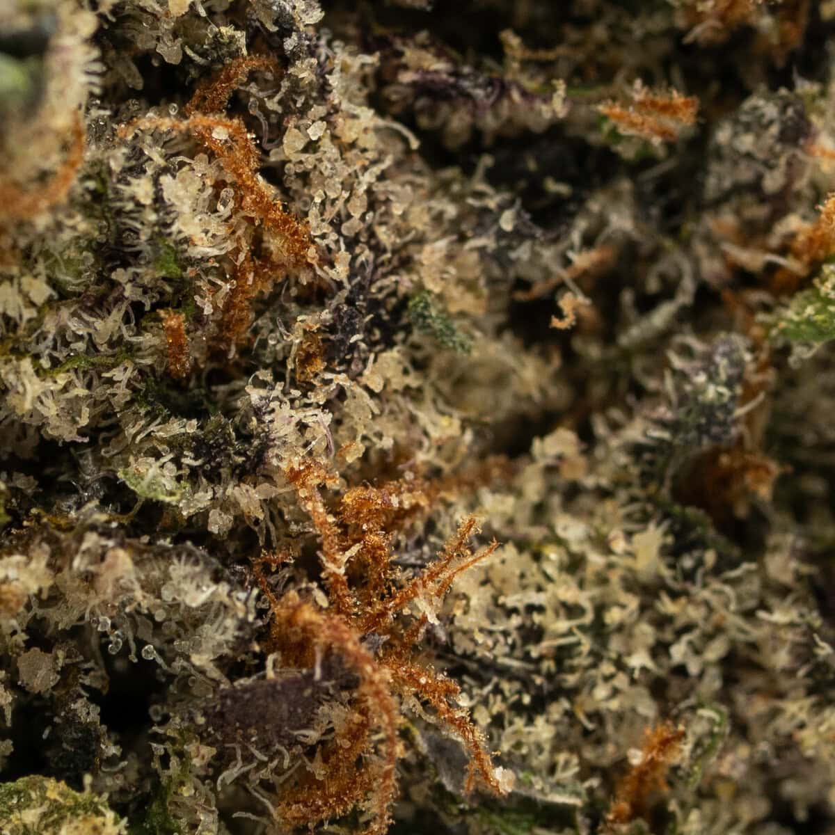 White Gummies showcases dense, frosty buds with light green and purple hues. Thick layers of crystalline trichomes coat the flower, giving it a sugary, candy-like look. Orange pistils weave throughout, adding contrast to its visually striking appearance.