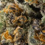 The buds of Blackberry Skunk are a visual masterpiece, showcasing grape-shaped, dark forest green nugs with darker undertones. Bright orange hairs weave through the dense buds, while a frosty coating of purple-tinted white trichomes hints at its potency and luxurious experience. This striking appearance is a testament to the strain’s high quality and flavorful lineage.
