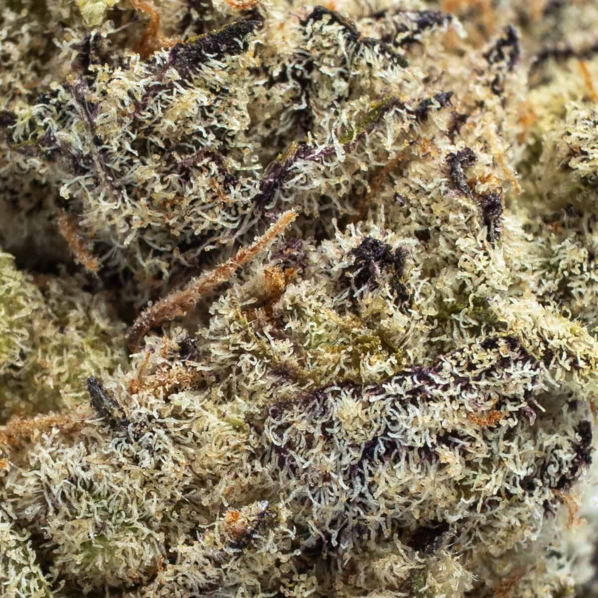 Cherry Gumbo buds are dense and resin-coated, with bright green hues accented by deep purple highlights. A frosty layer of trichomes covers the flower, while orange pistils give it a vibrant, candy-coated look.