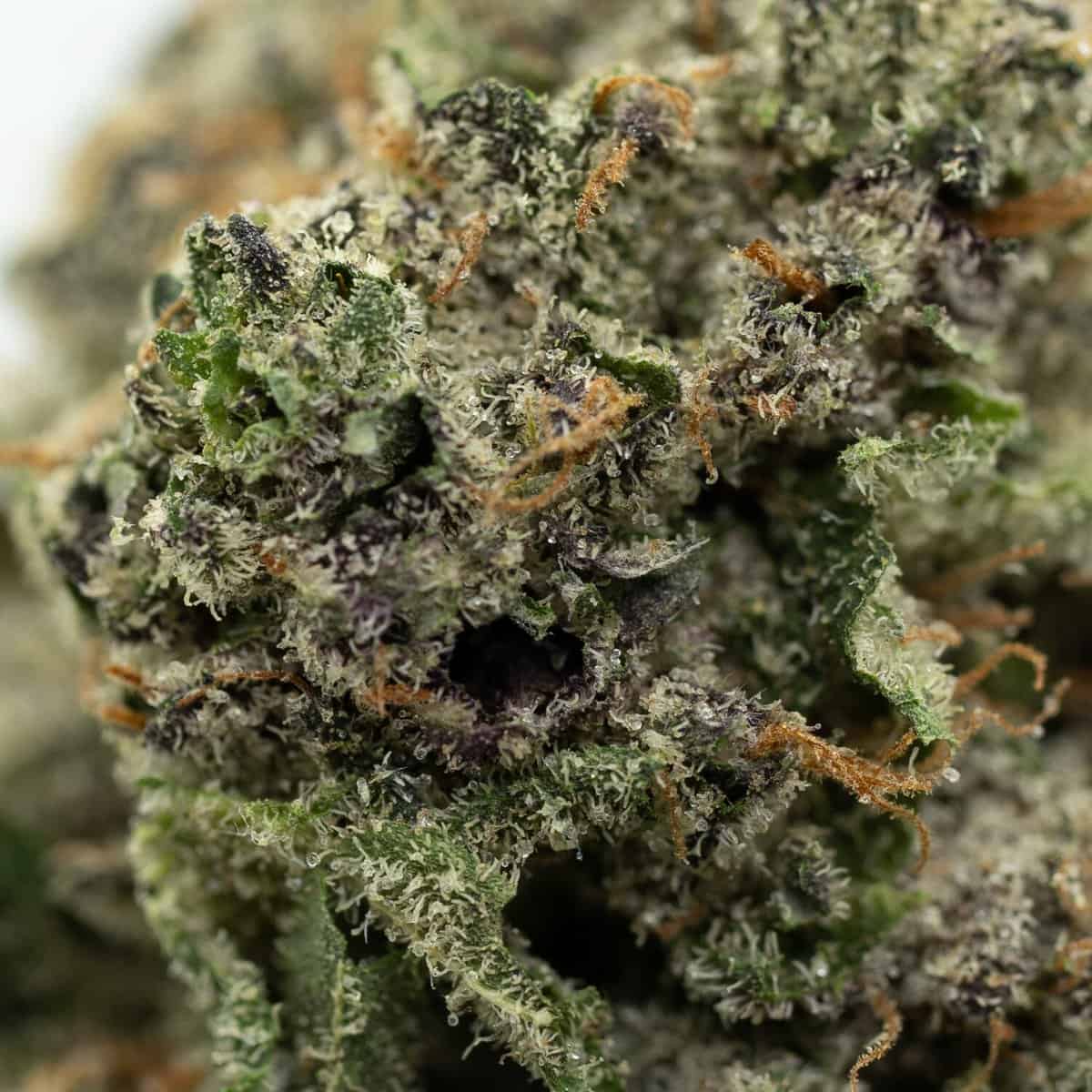 Grape Gelato buds are dense and beautifully structured, featuring a rich purple hue that is accentuated by a generous coating of frosty trichomes. The vibrant green leaves and bright orange pistils create a striking contrast, making these buds as visually appealing as they are potent.