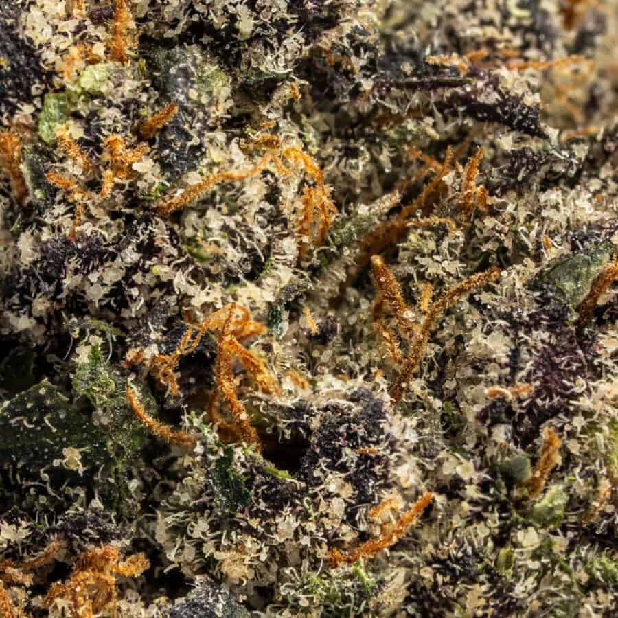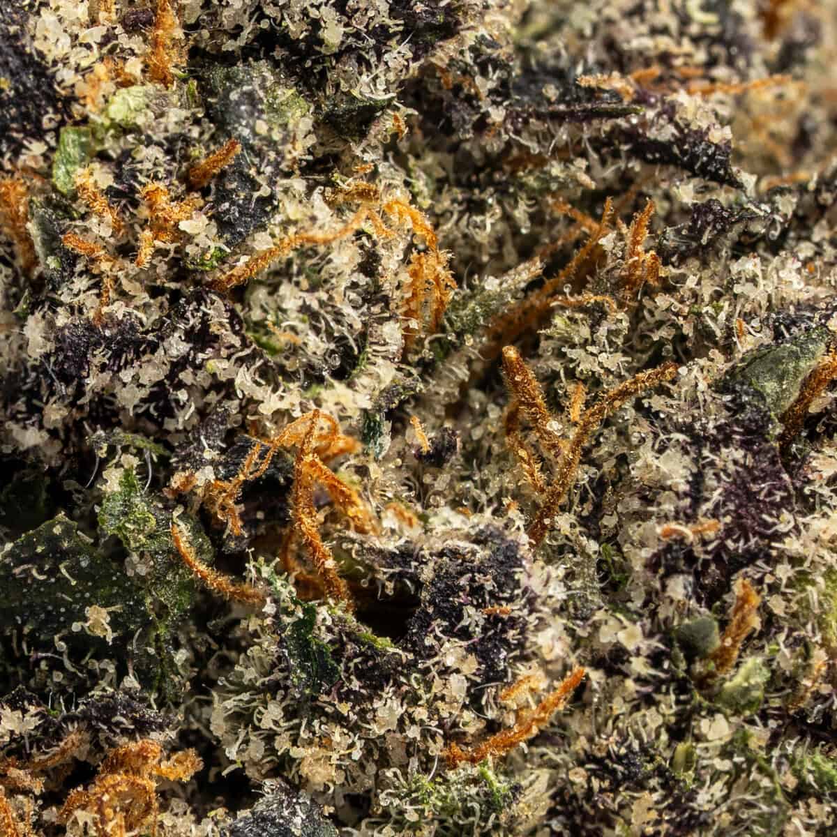 Gumbo buds are chunky and resinous, featuring deep green hues with subtle purple accents. Amber pistils curl throughout the flower, while a sticky coating of trichomes enhances its candy-like look.