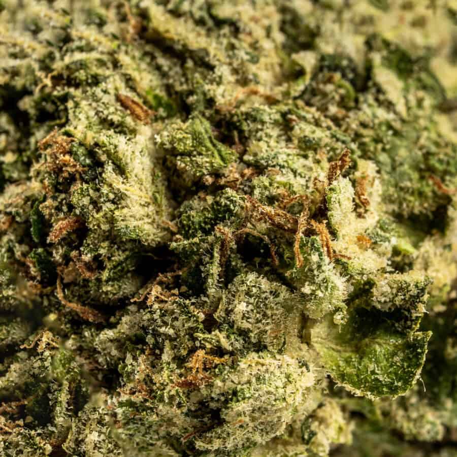 Orange Cookie Dough buds are dense and frosty, showing off bright green hues with streaks of deep orange. A thick coat of crystalline trichomes gives them a sugar-dusted appearance, while amber pistils weave throughout the flower, completing the “cookie dough” aesthetic.