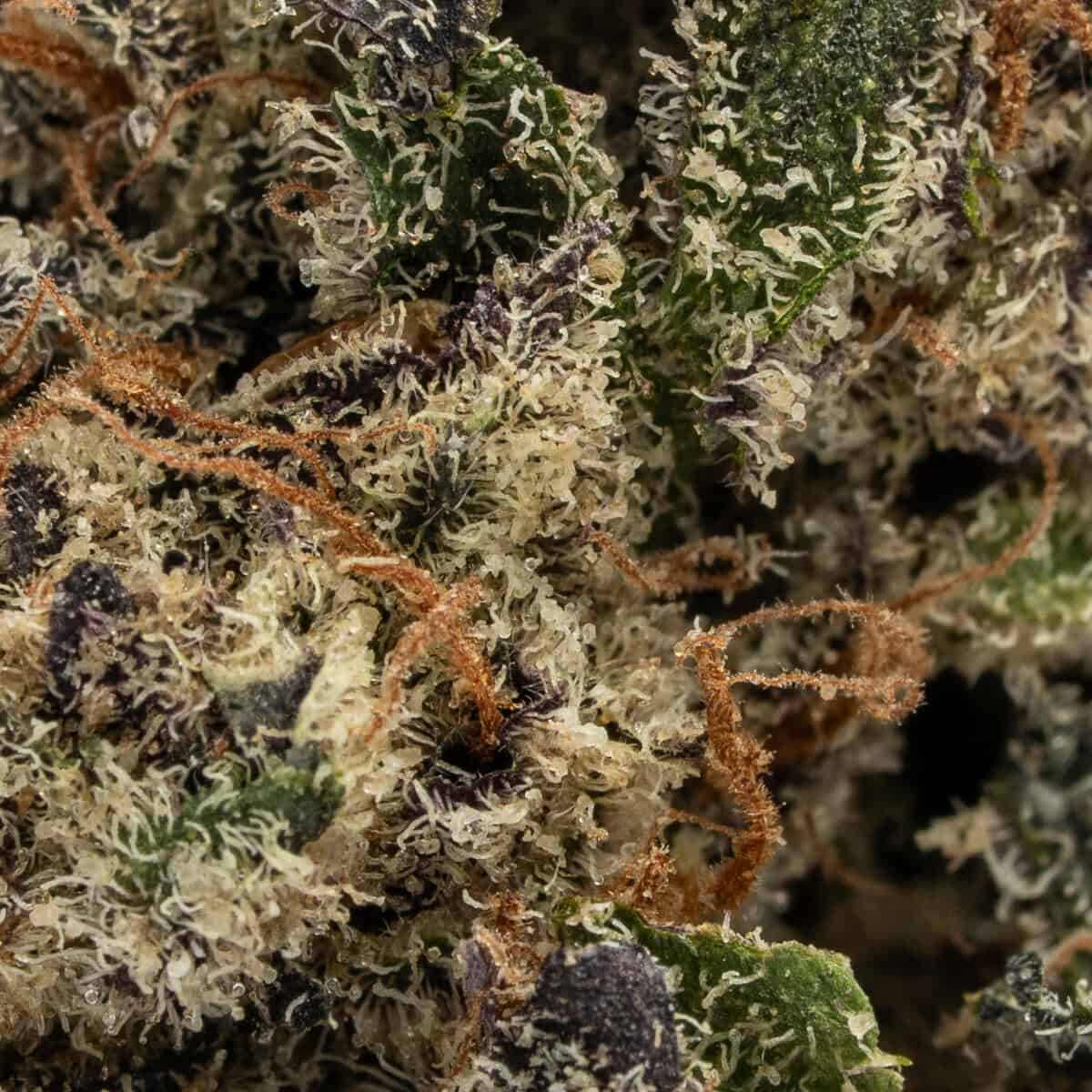 Pink Certz features dense, frosty buds with hints of lavender, light green, and pinkish hues. Thick layers of trichomes and fiery orange pistils complete its stunning presentation, giving the flower a sugary, sparkling glow.