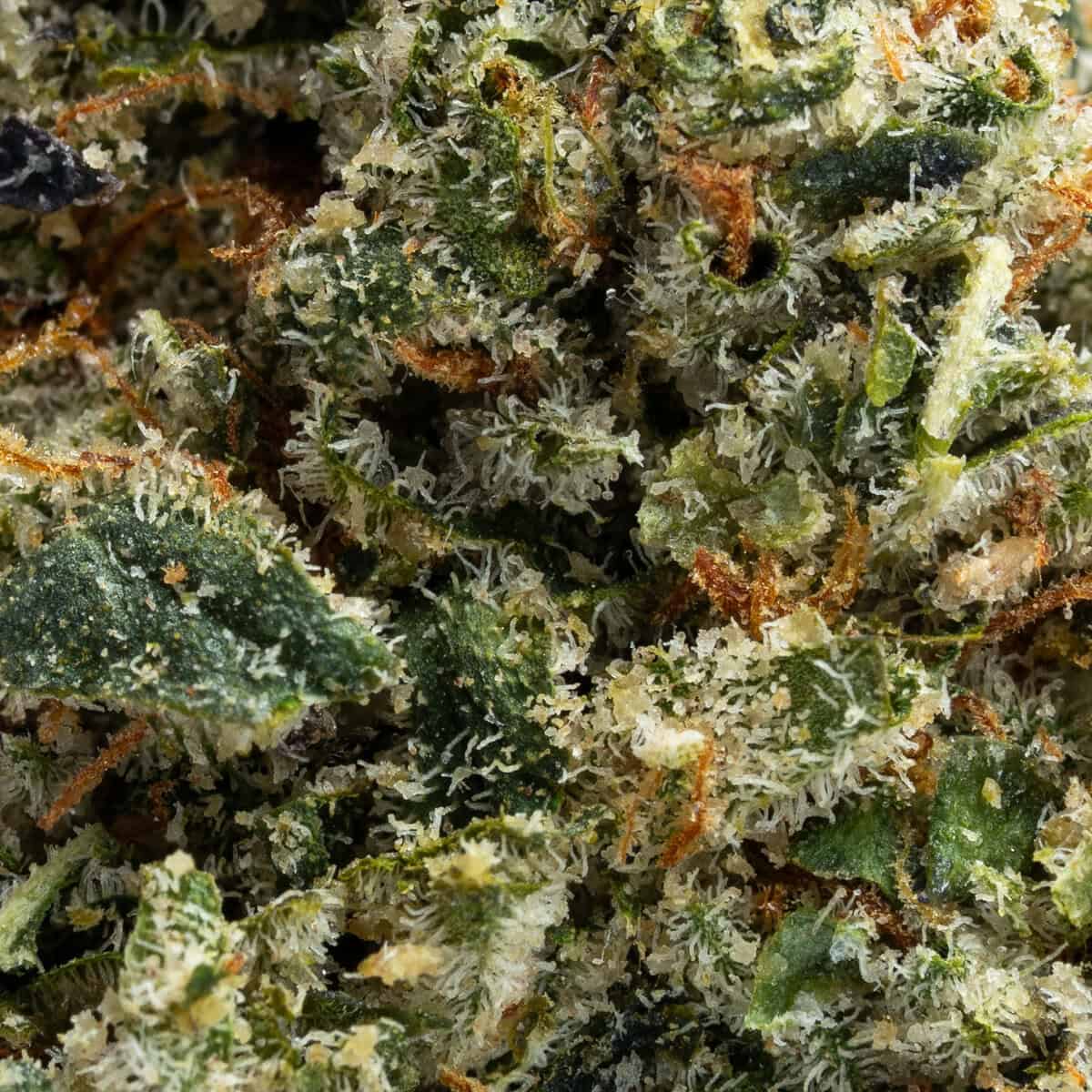 Rum Cake buds are dense, frosty, and richly colored, showcasing deep greens with subtle purples throughout. The nugs are coated in a thick sugary layer of trichomes, giving them a dessert-like sparkle. Bright amber pistils weave across the buds, adding warmth that matches the strain’s rich flavor profile.