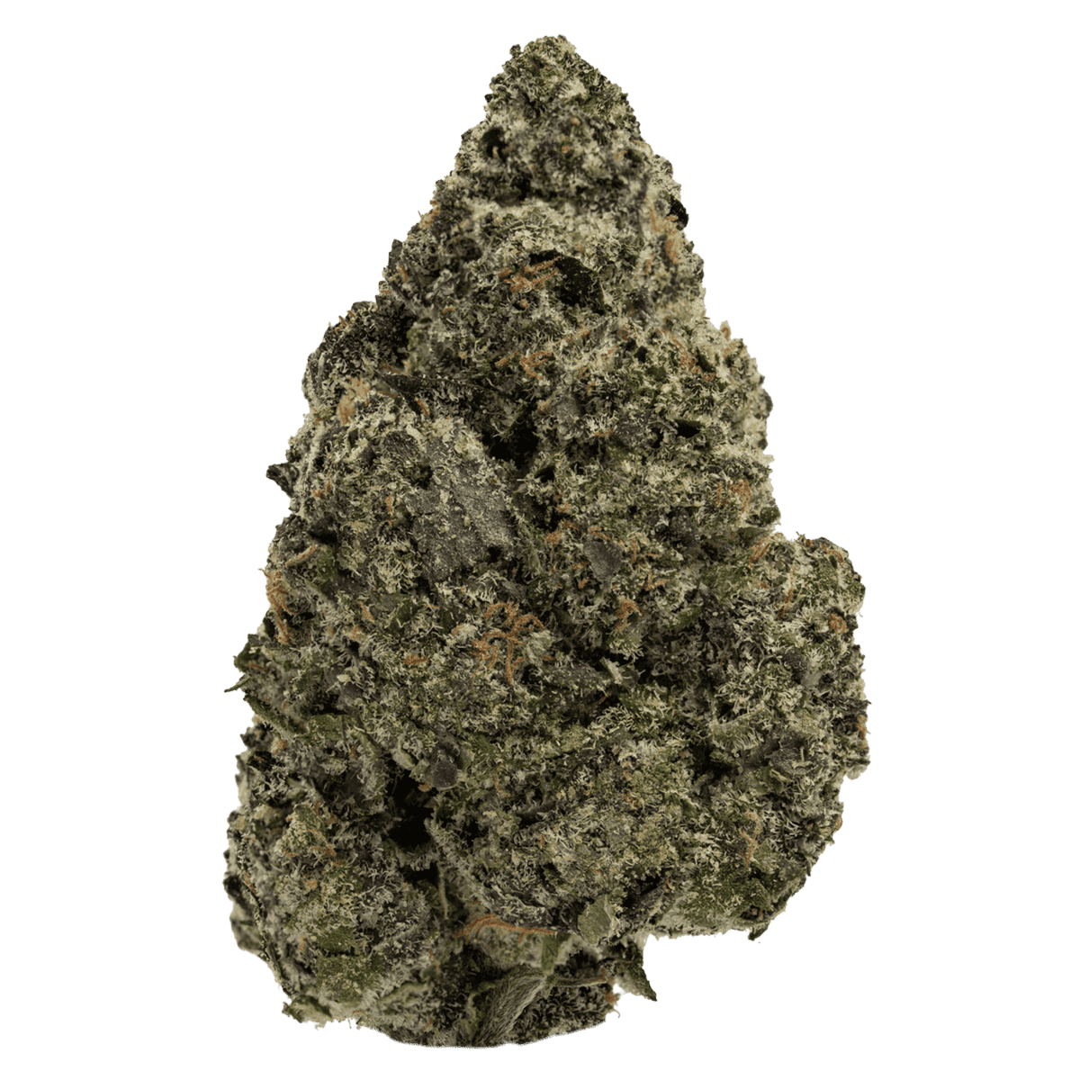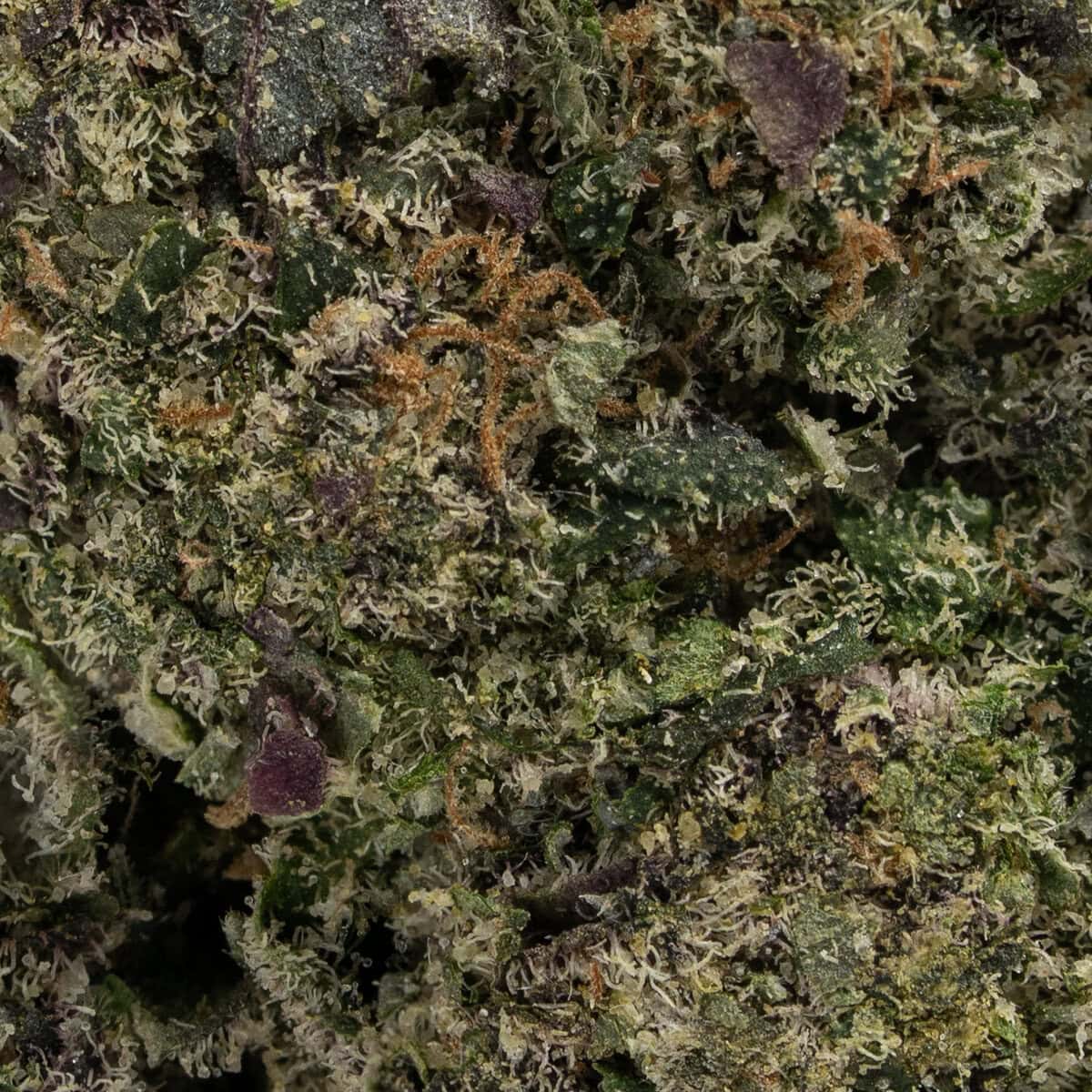White Runtz features dense, frosted buds with a mix of forest green and deep purple tones. A generous coating of milky trichomes gives the flower a glistening white appearance, complemented by fiery orange pistils for a striking finish.