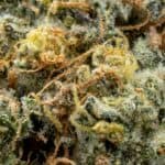 Beach Wedding features dense, dark green buds with deep purple hues and bright orange pistils. Its frosty trichome layer shimmers like sunlight on the ocean, highlighting its potency.