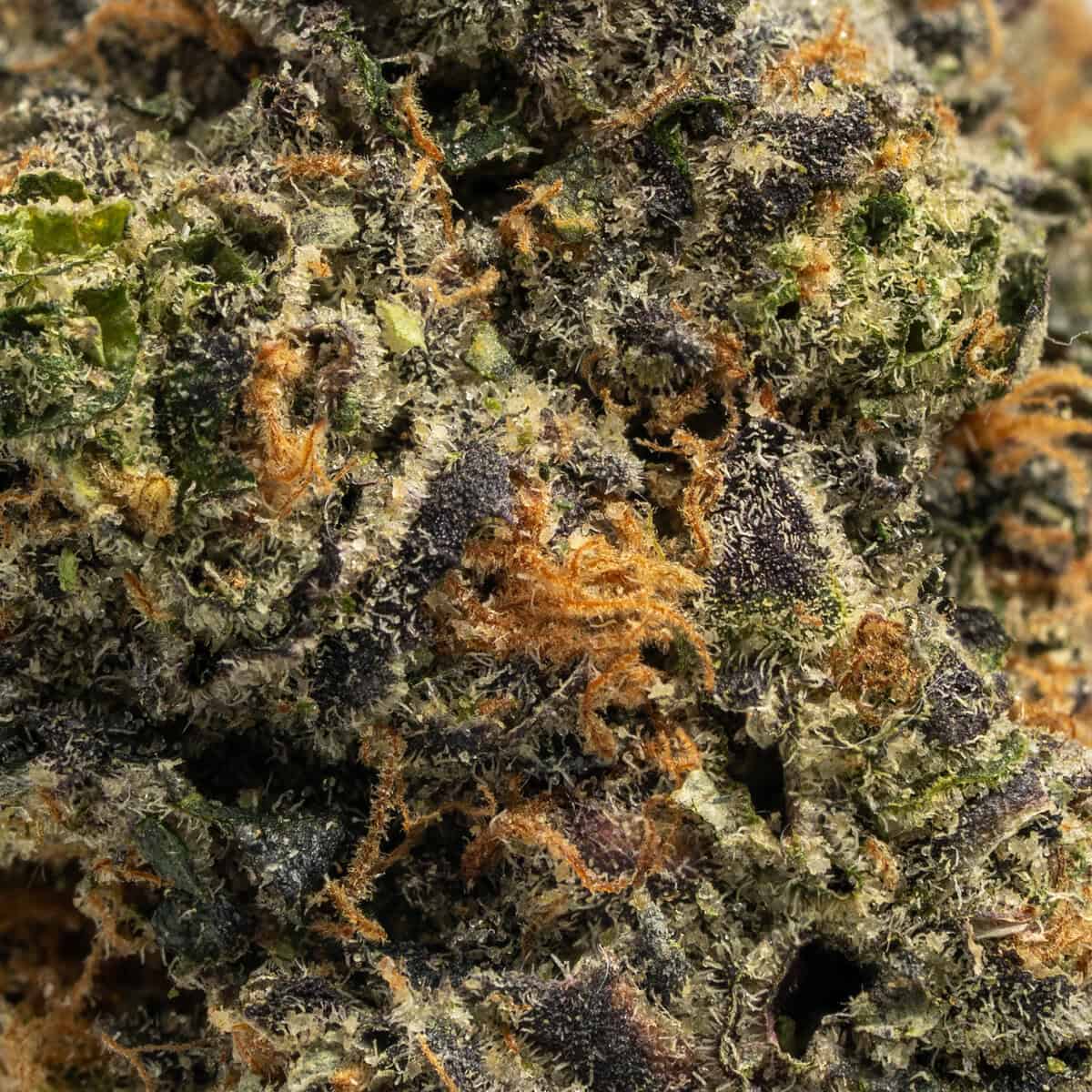 Cream Smoothie buds are dense and resinous, featuring deep green hues with hints of purple. A frosty blanket of trichomes coats the flower, giving it a sugar-dusted look, while fiery orange pistils add contrast and depth.