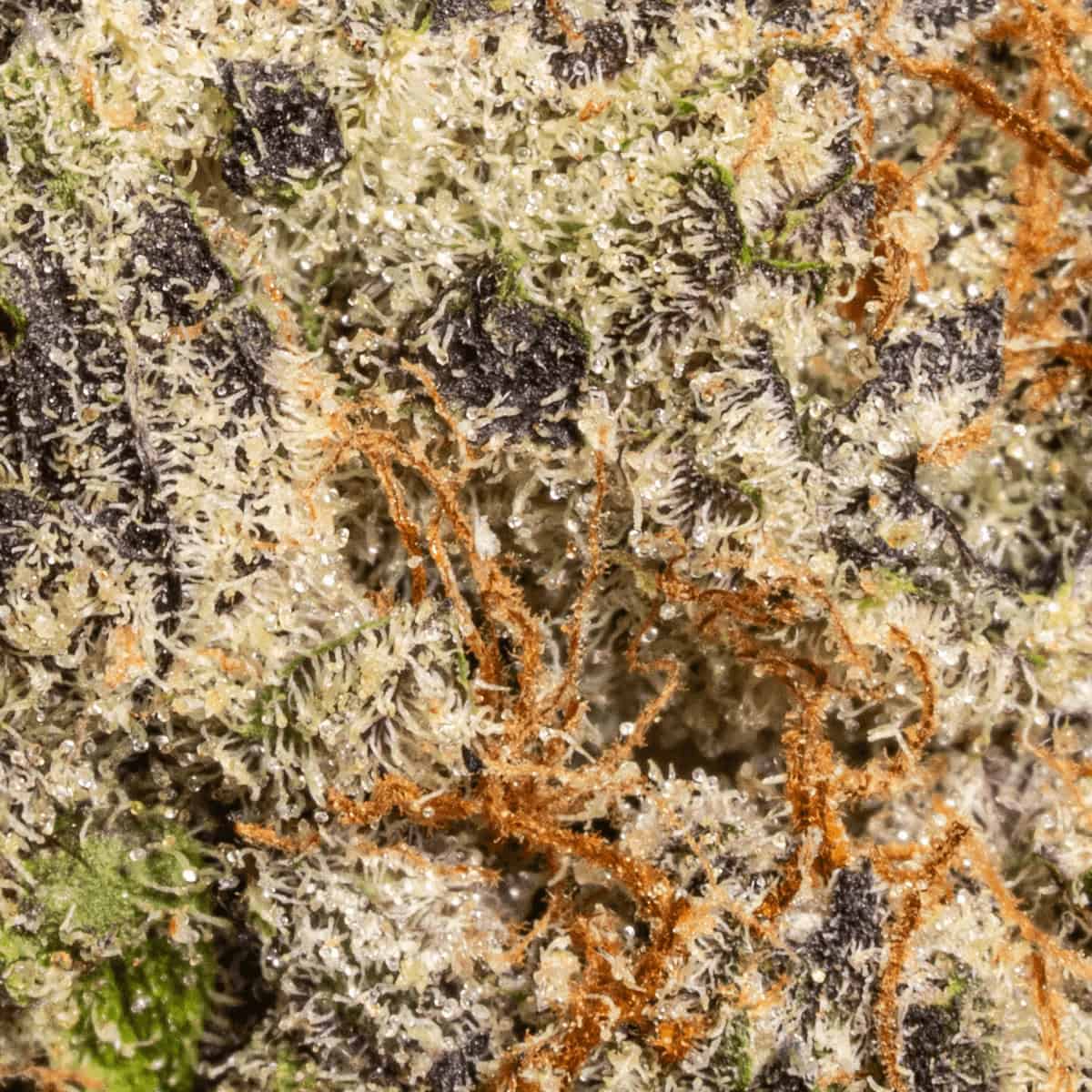 Gas Mask features dense, dark green buds with hints of purple and bright orange pistils. Its frosty coating of trichomes adds a sparkling, resinous texture, showcasing its premium quality.